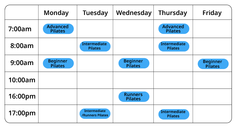 Weekly Pilates classes to strengthen your core and improve your fitness.